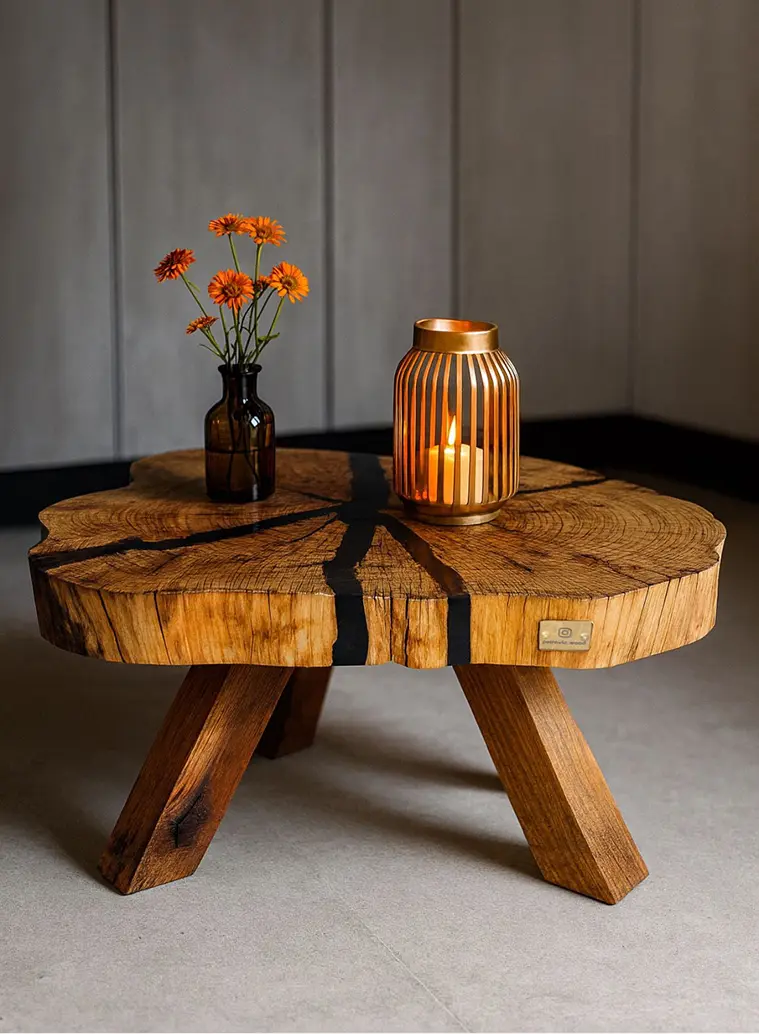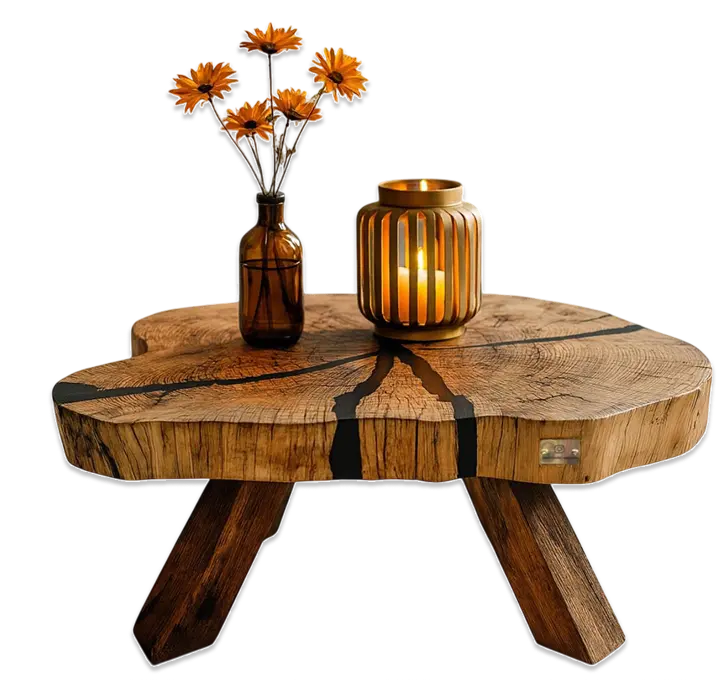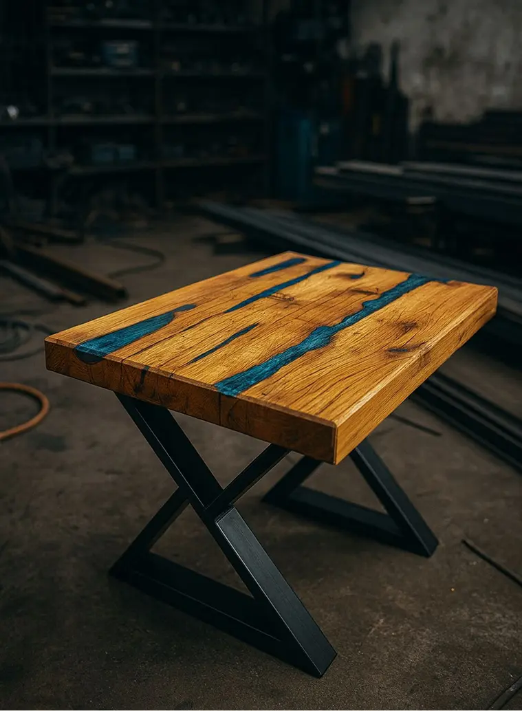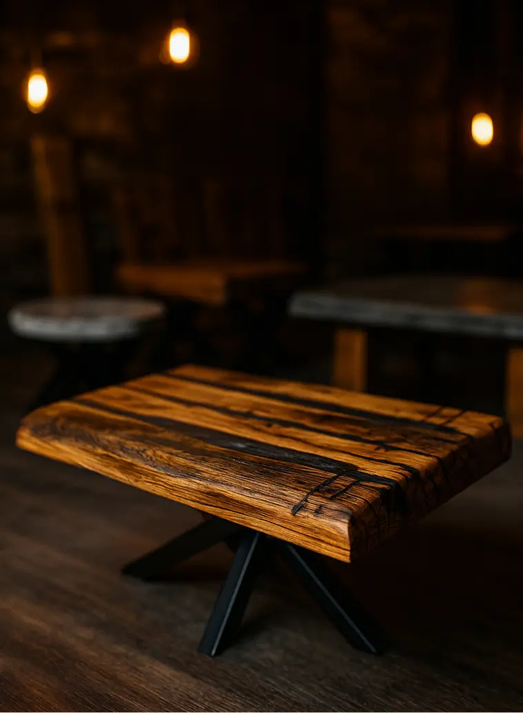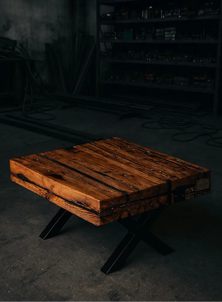 Klub sto od jednog komada starog hrasta sa crnom metalik epoksi smolom, i rustičnim nogama od starih greda. Moderan akcenat u svakom prostoru.