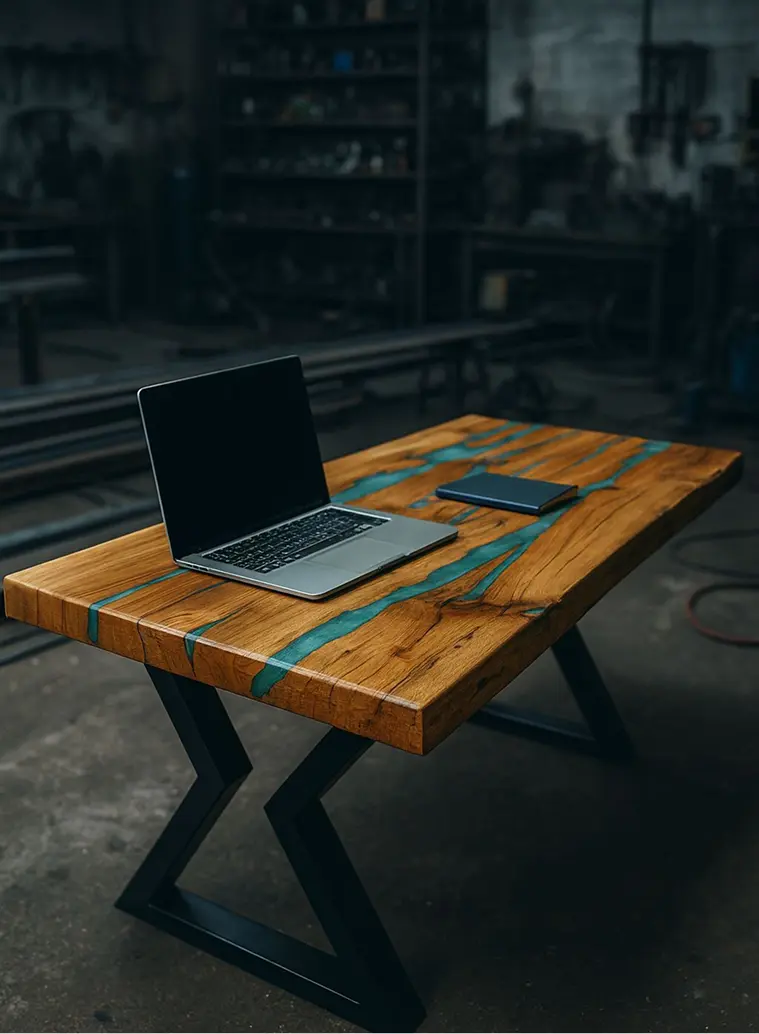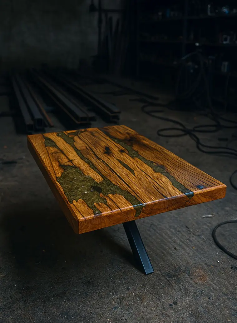 Stari hrast, tamno zelena epoksi smola i moderne metalne noge. Prava umetnička skulptura.