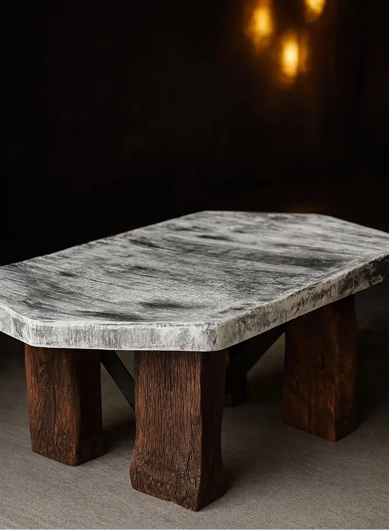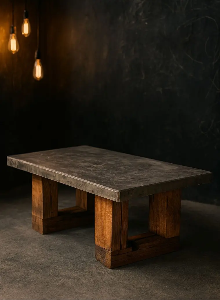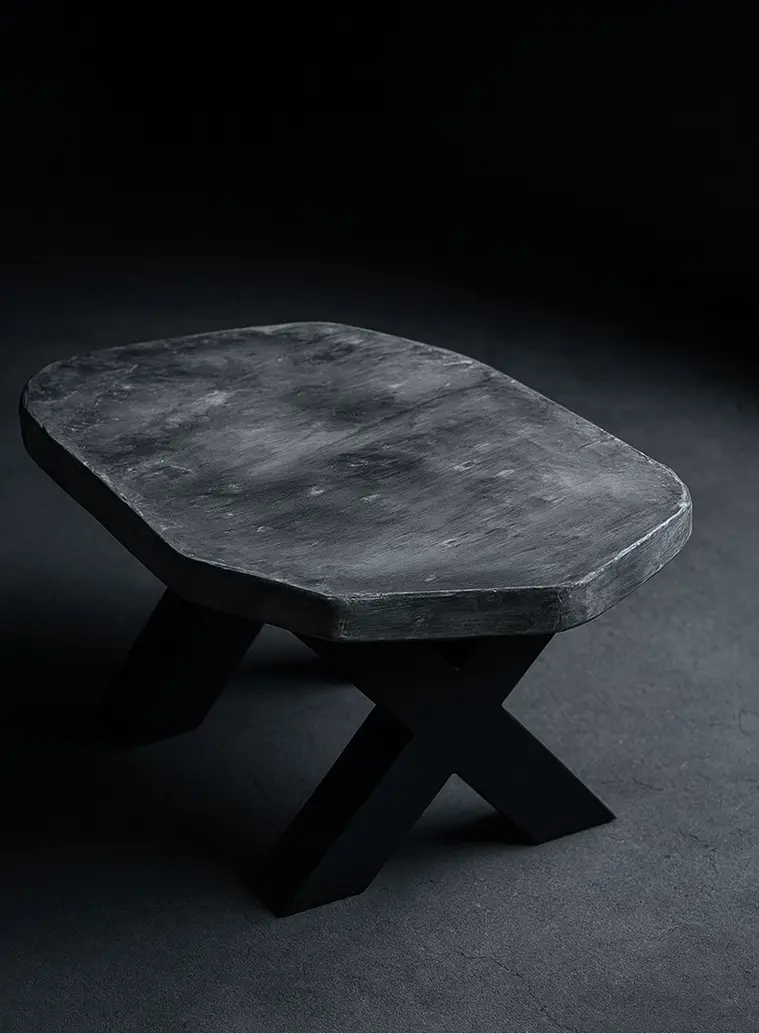 Naši stolovi nastaju iz kombinacije materijala koji se međusobno dopunjuju: betona, drveta, metala i epoxy smole. Nekad je sto potpuno od betona, nekad dominira drvo, nekad je fokus na epoxy detalju, ali svaki sto nosi isti DNK: masivan, stabilan i vizuelno upečatljiv.