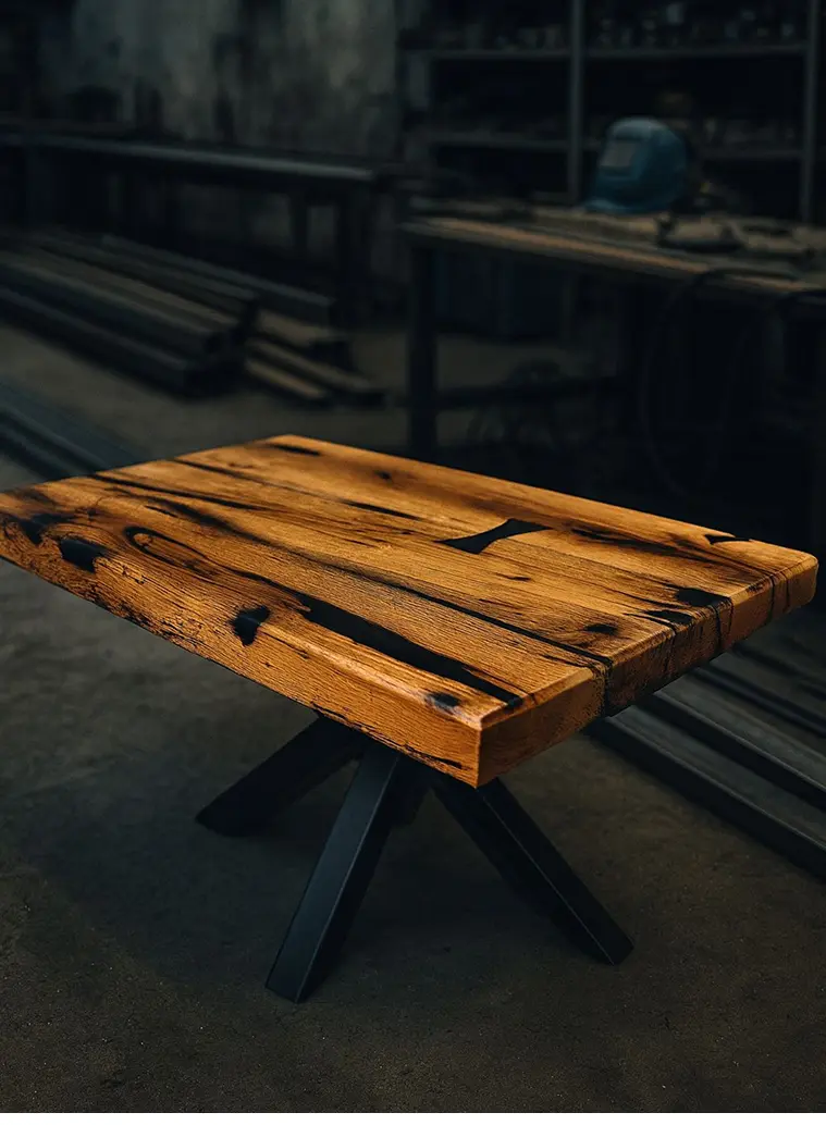 Klub sto od vek starih greda, obogaćen crnom, belom i titanijum epoksi smolom, na modernim metalnim nogama.