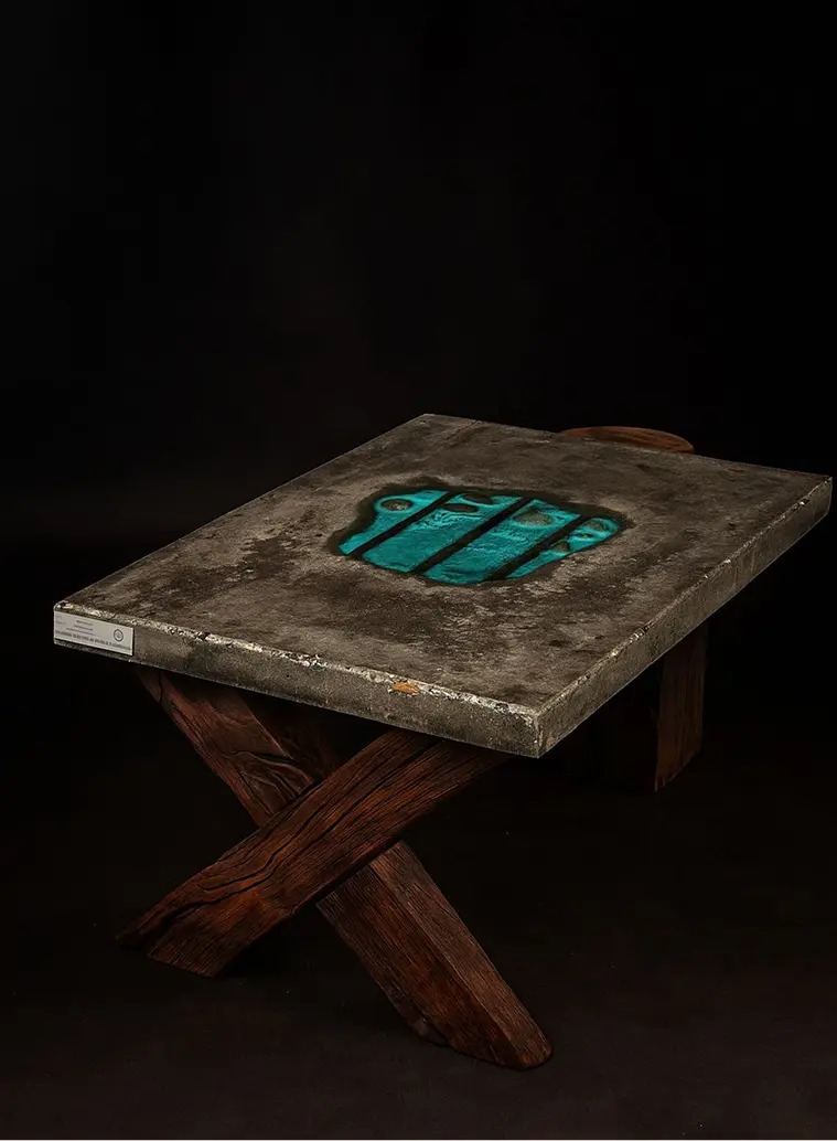 Klub sto sa masivnom betonskom pločom i sa detaljima tirkizne epoksi smole, koji se oslanjaju na noge od starih greda hrasta.